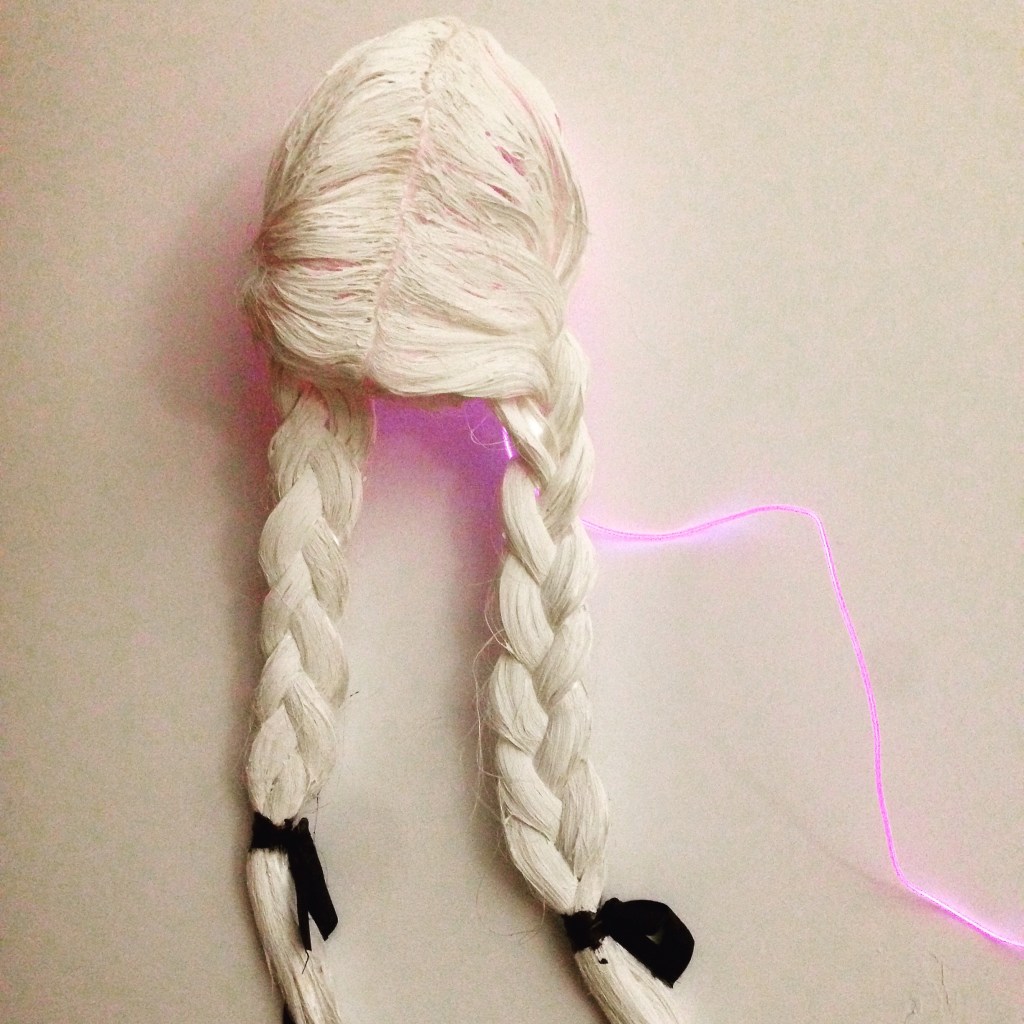 Sculpture en forme de perruque blanche avec tresses et nœuds noirs: regardant ainsi le mur. Néon climatique rose: Ainsi donc la fille que j’était.